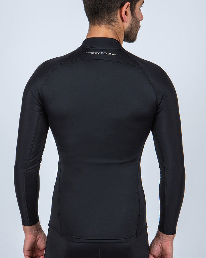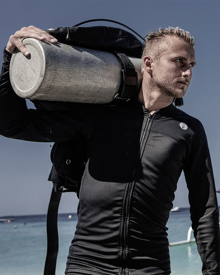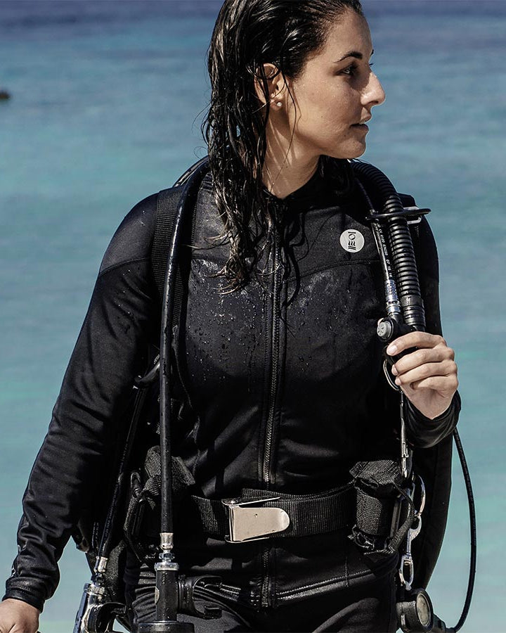 Crafted with 78 % recycled nylon from ghost fishing nets, Thermocline is an OceanPositive innovation combining a waterproof membrane and thermal fleece for exceptional comfort in and out of the water. The inner fleece draws moisture away from the skin while the outer layer blocks wind and traps warmth, making it perfect for both underwater and surface activities.