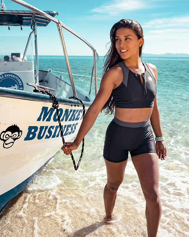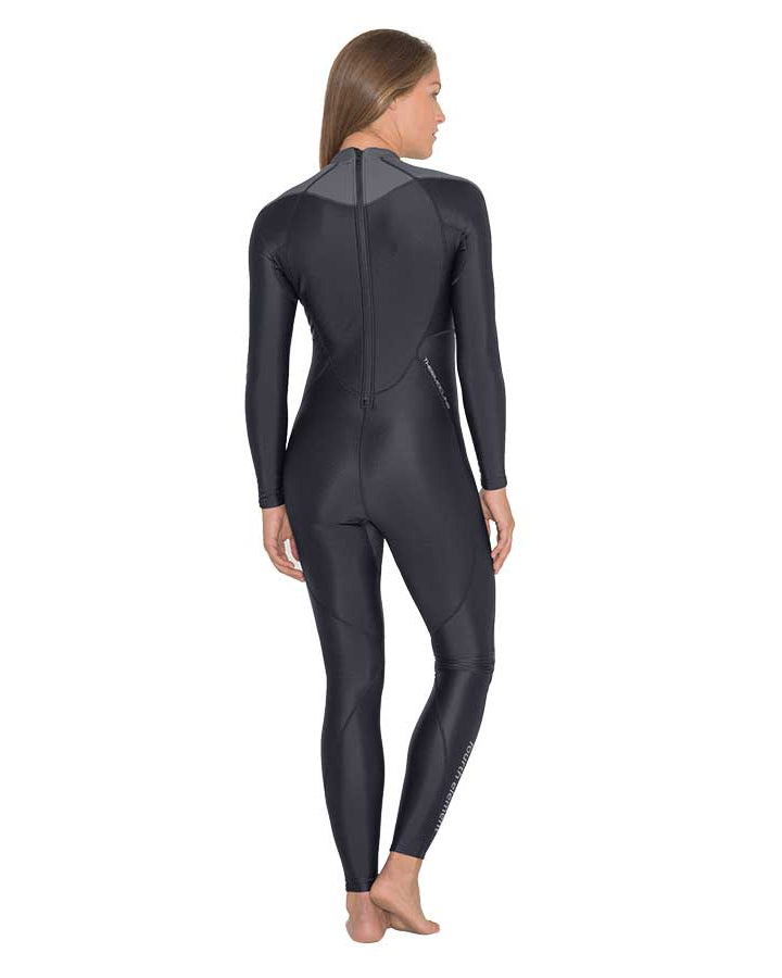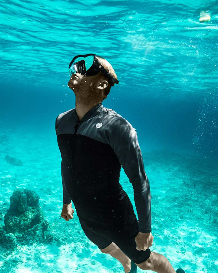 Choose between the one-piece suit or the two-piece system (top + leggings). The modular design allows a personalized fit, which is perfect when the body requires different top and bottom sizes, and makes it effortless to put on or remove between dives. Both options deliver reliable sun and sting protection, breathable comfort, and easy movement.